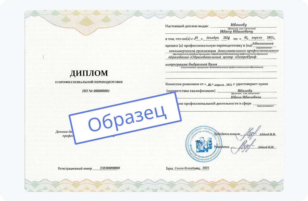 Учебный центр «ПетроПроф» выступает в роли современного института профессионального образования, предлагая программы профессиональной переподготовки и курсы профессиональной переподготовки, которые позволяют специалистам освоить новую профессию или повысить квалификацию в актуальной сфере. В рамках дополнительного профессионального образования вы освоите обновлённую программу обучения, включающую сбалансированную теорию и практику, которые подготовят вас к работе в новой сфере. Выбирая курсы профессиональной переподготовки в "ПетроПрофе", вы получаете современную программу обучения, разработанную с учетом государственных стандартов и требований рынка труда. Обучение ведётся на базе лицензии, полностью соответственной ФЗ № 273‑ФЗ «Об образовании», а также приказу Минобрнауки № 499‑н.
