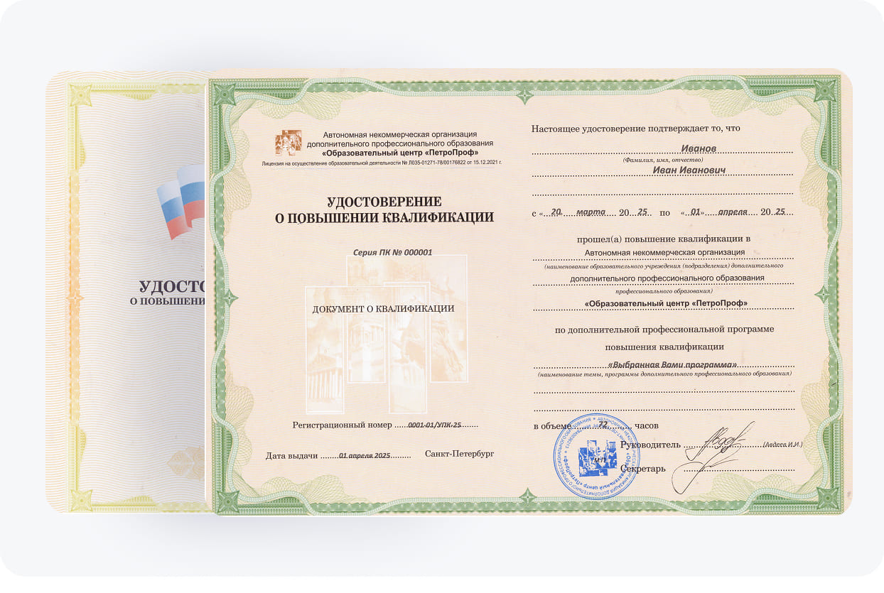 Документ об образовании гос.образца официально признается работодателями всех уровней образования и социальной сферы России. Наша образовательная организация обладает официальной лицензией на осуществление образовательной деятельности. Мы гарантируем высокое качество услуг и выдачу документов о дополнительном профессиональном образовании, соответствующих требованиям законодательства РФ.